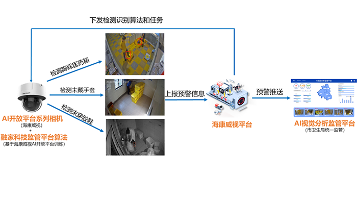 智能攝像機采集醫療廢物暫存間視頻圖像,通過??低旳I開放平臺生成的算法模型識別工作人員未戴手套、未穿膠鞋、腳踩醫療廢物等醫療廢物處置問題,形成預警事件信息,并傳送至AI視覺分析監管平臺。