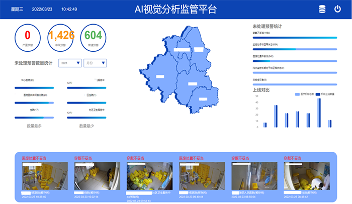 AI視覺分析監管平臺直觀展現預警大數據分析結果,監管部門經過接收醫療機構預警處理狀況,整體把握區域內的辦理狀況,全面強化了衛生健康綜合執法監管力度。