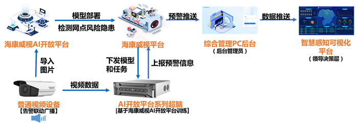 根據國家對金融科技發展的規劃要求,以及銀行網點推進數字化轉型的實際需要,場景現場采用“視頻+AI” 技術,通過海康威視AI開放平臺訓練的場景化AI算法,對銀行網點內隱患事件進行檢測并實時報警,有效保障網點安全、高效運轉。