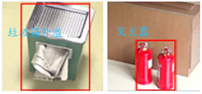 針對銀行網點消防設備存放處的滅火器進行檢測,若未檢測到滅火器設備及時預警上報,通知相關人員補充設備,保障銀行網點的消防安全;針對垃圾箱外溢,垃圾箱上方有雜物進行檢測,及時發現并處理,保證網點環境清潔。