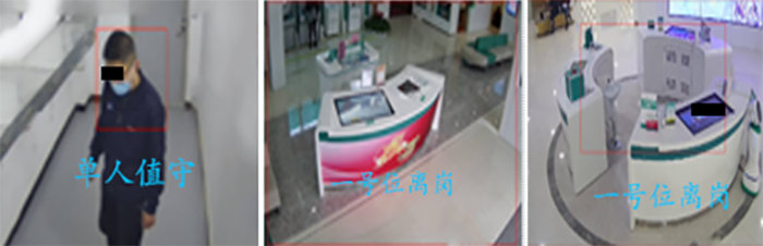 針對廳堂內保安人員或者重要工作崗位上長時間無人,單人進入加鈔間等情況及時發現并報警至后臺,同時保留相應的視頻和圖片,可用于后續網點合規的標準化。